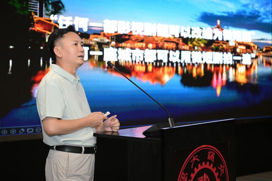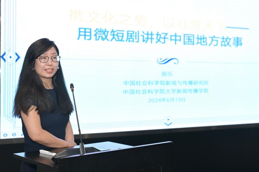 新闻与传播研究所副所长、广播影视研究中心主任殷乐以《携文化之势,以壮游天下——用微短剧讲好中国地方故事》为题发表演讲。
