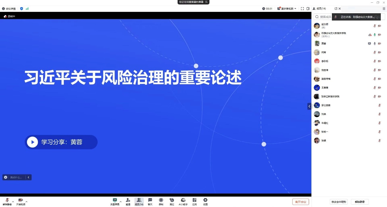 此次“学习强科”业务研讨活动,深入学习讨论了习近平总书记关于风险治理与意识形态工作的重要论述,加深了对习近平总书记重要讲话精神的理解,更激发了对新时代风险治理与意识形态工作的责任感与使命感。在风险治理方面,积极关注国内外形势变化,增强忧患意识,坚持底线思维,为国家的长治久安贡献自己的力量。在意识形态工作方面,牢牢把握意识形态工作的领导权、管理权和话语权,不断巩固壮大主流思想舆论,提升新闻舆论的传播力、引导力、影响力和公信力。新媒体系将持续深入学习贯彻习近平总书记的重要讲话精神,将学习成果转化为推动学科建设、科研创新和服务社会的强大动力。