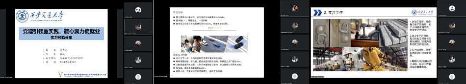 2022级硕士生第四党支部入党积极分子冯秀志、李文彪和李航分别从实习工作内容、体验和收获三方面分享自己的暑期实习经历。在西安航天动力研究所实习的冯秀志鼓励支部成员们在实习和科研过程中多思考多请教,以收获更多实践性知识;在自动驾驶公司Momenta实习的李文彪建议研一的学弟学妹们“提前想好自己的优势方向”,针对性地积累实习经历以提高自身竞争力;在中铁工程设计有限公司实习的李航提醒支部成员们注重理论与实践相结合,通过实习或工作来锻炼自己。