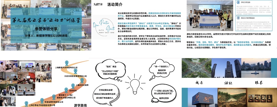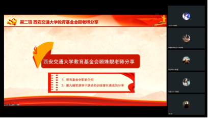 在分享环节,西安交通大学教育基金会老师顾姝靓从发展历程、资金募捐情况、公益实践活动等方面对教育基金会进行了简要介绍,并分享了教育基金会联合其他单位组织的两项游学活动——视界启航:学生视野拓展之旅和思源学子“源动力”训练营两项游学活动,旨在帮助学生拓宽视野,提升认知,增强对未来发展的信心。