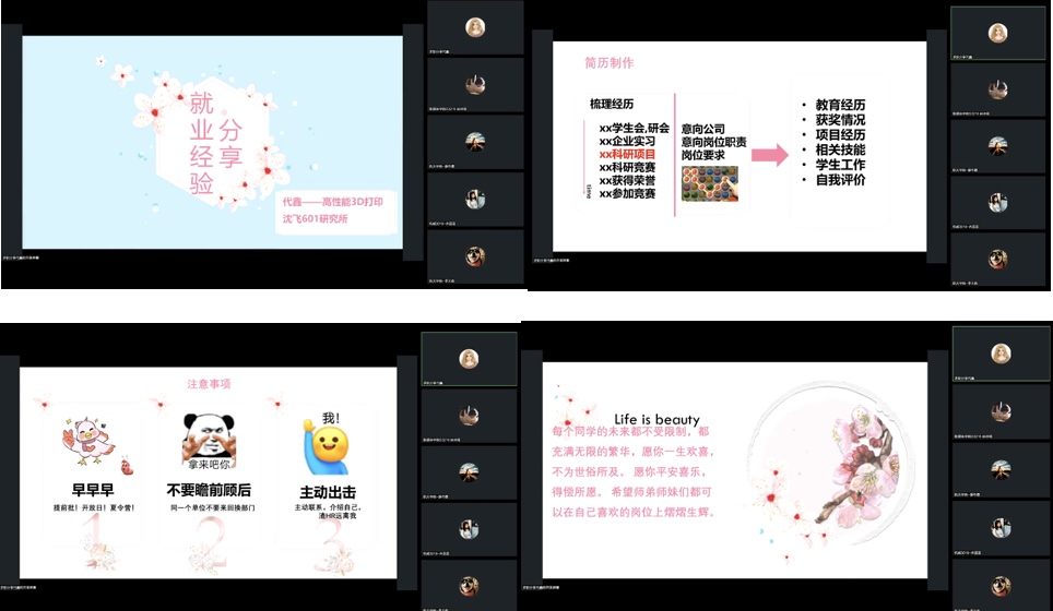 2024届毕业生代鑫以在职人员的身份分享了求职经验。今年8月,代鑫顺利入职沈阳601研究所。她详细介绍了简历制作的技巧,并以生动有趣的方式,结合自身经历分享了求职规划和面试技巧。代鑫鼓励支部成员们自信地迎接挑战,打破焦虑,祝愿每位成员都能在自己心仪的岗位上熠熠生辉。
