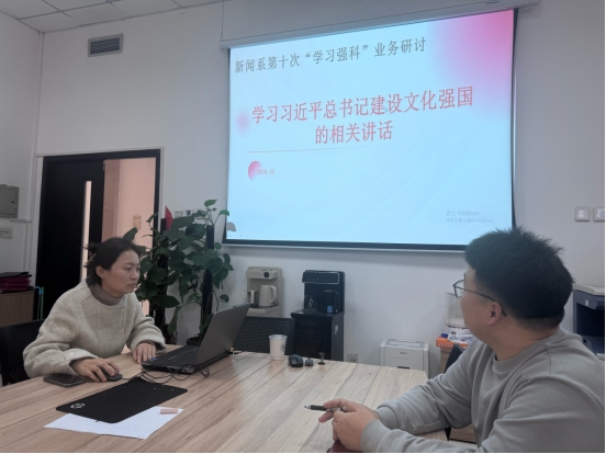 新闻系在主楼E409新闻系办公室组织开展第十次“学习强科”业务研讨活动。本次活动的主题为“学习习近平总书记建设文化强国的相关讲话”,系主任徐婧副教授主持本次活动,助理教授刘丹领学,系所教师及博士生参与本次学习研讨。