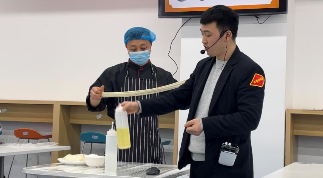 活动伊始,授课教师马荣以专业且生动的方式,围绕拉面的历史源流、拉面与牛肉面的差异,以及拉面的制作方法等内容,为同学们展开细致讲解。讲解过程中,经验丰富的拉面师傅同步演示,完整地向学生们呈现了拉面制作的全流程。