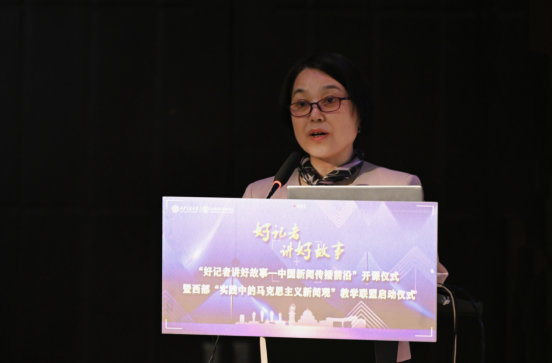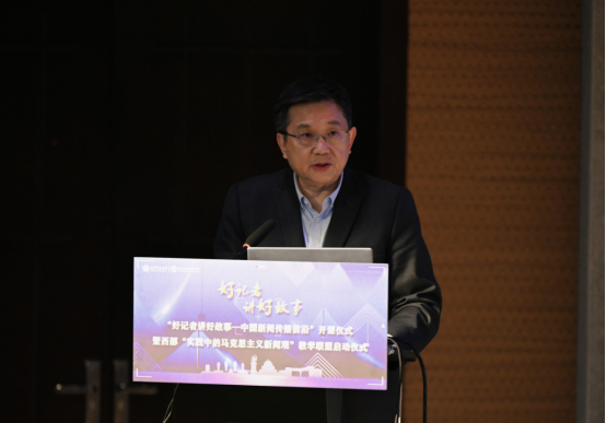 院长汪文斌发布“好记者讲好故事——中国新闻传播前沿”课程报告,系统阐述了课程的筹备和规划情况,倡议成立西部“实践中的马克思主义新闻观”教学联盟,强调打造西部“实践中的马克思主义新闻观”虚拟教研室,构建“思政素养+专业技能+智能技术”贯穿的培养体系,为新时代输送懂国情、有担当、会创新的新闻尖兵。“好记者讲好故事——中国新闻传播前沿”课程依托“好记者讲好故事”“中国新闻传播大讲堂”两大优质资源,采取“线上-线下”相结合的混合式教学模式,通过优秀新闻人的亲历故事,感召一代又一代的新闻学子重返新闻现场,锻造职业理想和职业能力。