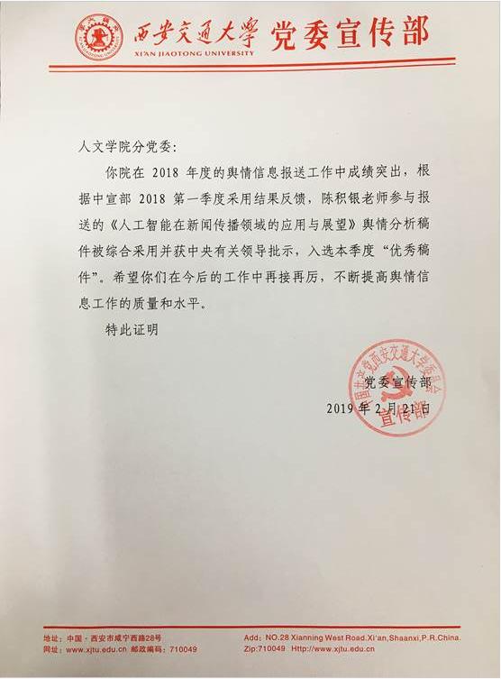 近日,pg电子试玩 陈积银教授参与报送的《人工智能在新闻传播领域的应用与展望》舆情分析稿件于2018年第一季度被综合采用并获中央有关领导批示,入选该季度“优秀稿件”。