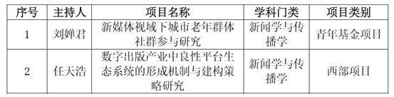 3月15日,2019年度教育部人文社会科学研究一般项目结果公布。我院共有2个项目通过立项评审。此次获批项目分别为刘婵君老师主持的“新媒体视域下城市老年群体社群参与研究”、任天浩老师主持的“数字出版产业中良性平台生态系统的形成机制与建构策略研究”。此次2项课题获得立项,是近年来pg电子试玩 在科学研究坚持聚焦“新媒体与社会治理”等方向所取得成效的重要体现。