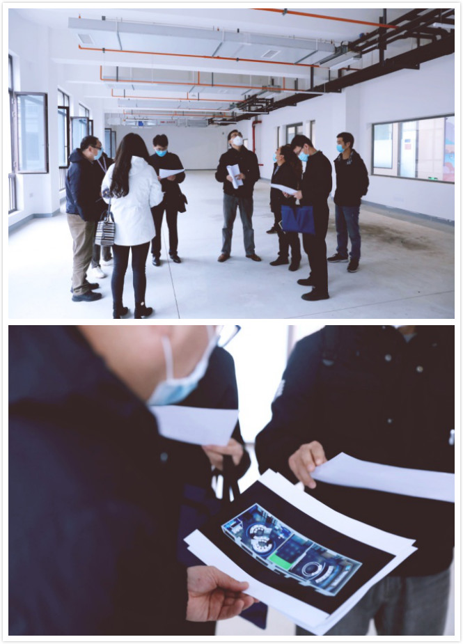为了不影响进度,“新媒体智慧学习工场”在疫情期间的建设也没有松懈,无法进场施工就积极开展虚拟场景素材的设计工作,包括完成施工效果图、装修方案,完成新媒体体验模块的线上视频资源的文案策划。3月22日,在完成各项审批手续之后,合作方北京华晟经世信息有限公司施工人员立即入驻创新港,进行实地测量、设计,开始施工的前期准备工作,紧锣密鼓地入驻场地抢赶因疫情耽误的工作进度。