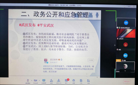 会议伊始,祝老师提出疫情期间互联网相较于电视具备不可比拟的优越性,他认为,互联网是了解舆情的窗口,保障了网民的知情权、参与权、表达权和监督权。同时他倡导媒体从业人员牢记媒体人的使命,关注民间叙事,树立社会责任感,真实并带有温度地报道新闻、传播信息。随后,祝华新老师将疫情初期及中后期武汉政府的做法、武汉本地媒体和外地媒体报道做了比较,批判了在疫情早期武汉政府瞒报疫情、不作为等现象,对外地媒体尤其是央媒的行动力表示赞扬。他认为当发生突发事件时,政府应在第一时间发布信息,做出回应。并对疫情期间大数据的表现也做出分析。