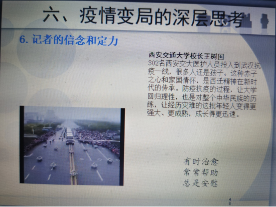 讲座在祝老师和线上来宾们的热烈讨论中结束。最后祝老师表示,没有一个冬天不可逾越,相信在全国人民的共同努力下,一定会战胜疫情。并引用王树国校长的话“302名西安交大医护人员投入到武汉抗疫一线,很多人还是孩子。这种赤子之心和家国情怀,是西迁精神在新时代的传承。防疫抗疫的过程,让大学回归理性,也是对整个中华民族的历练,让经历灾难的这批年轻人变得更强大、更成熟,成长得更迅速。”