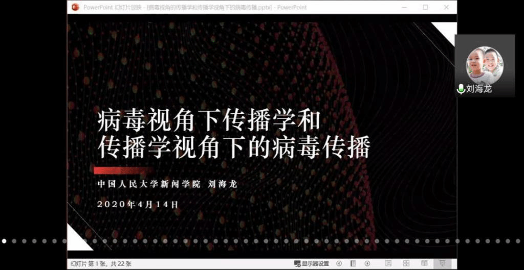 响应建设思想交大、智力交大的号召,打造学术交流平台“新新论坛”,以弘扬新学术、传播新思想、推介新人物。4月14日晚7点,“新新讲坛”第五十二讲“病毒视角下的传播学与传播学视角下的病毒”学术讲座在腾讯会议顺利召开。论坛由我院副院长张宏邦主持,主讲嘉宾为中国人民大学刘海龙教授,此次线上“新新论坛”吸引了校内外师生逾300人热情参与。