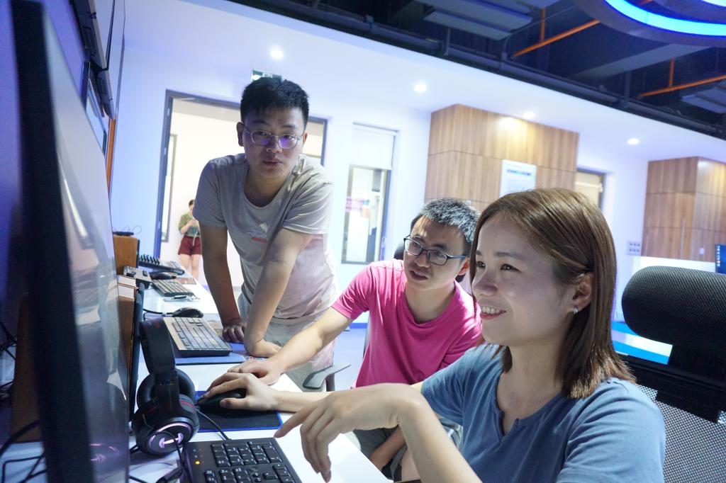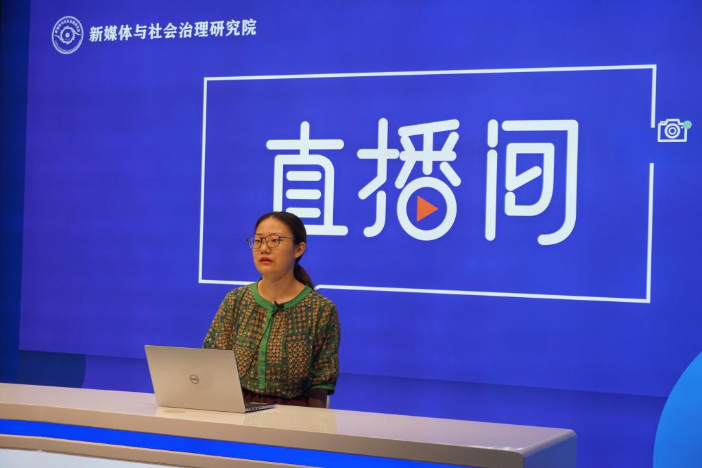 新媒体与社会治理研究院研究生在教学直播舱内讨论各大直播平台的区别