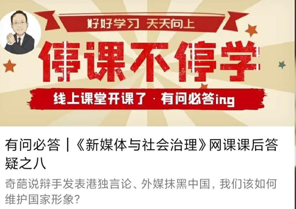 很多学生在课上直接提问,有些问题既尖锐又深刻,李明德没有选择避而不谈,而是凭借课前充分的准备,既回应了学生关切,又很好地展现了积极乐观的态度和导向,让学生接受有理由,受益不反感,特别是联系疫情实际对新媒体概念和国家治理现代化的生动阐述,让学生面对艰深理论概念不枯燥,甚至有听课如听相声的感觉。“就像段子手,包袱一个接一个”,课后部分学生反馈了李明德在线第一讲的印象。