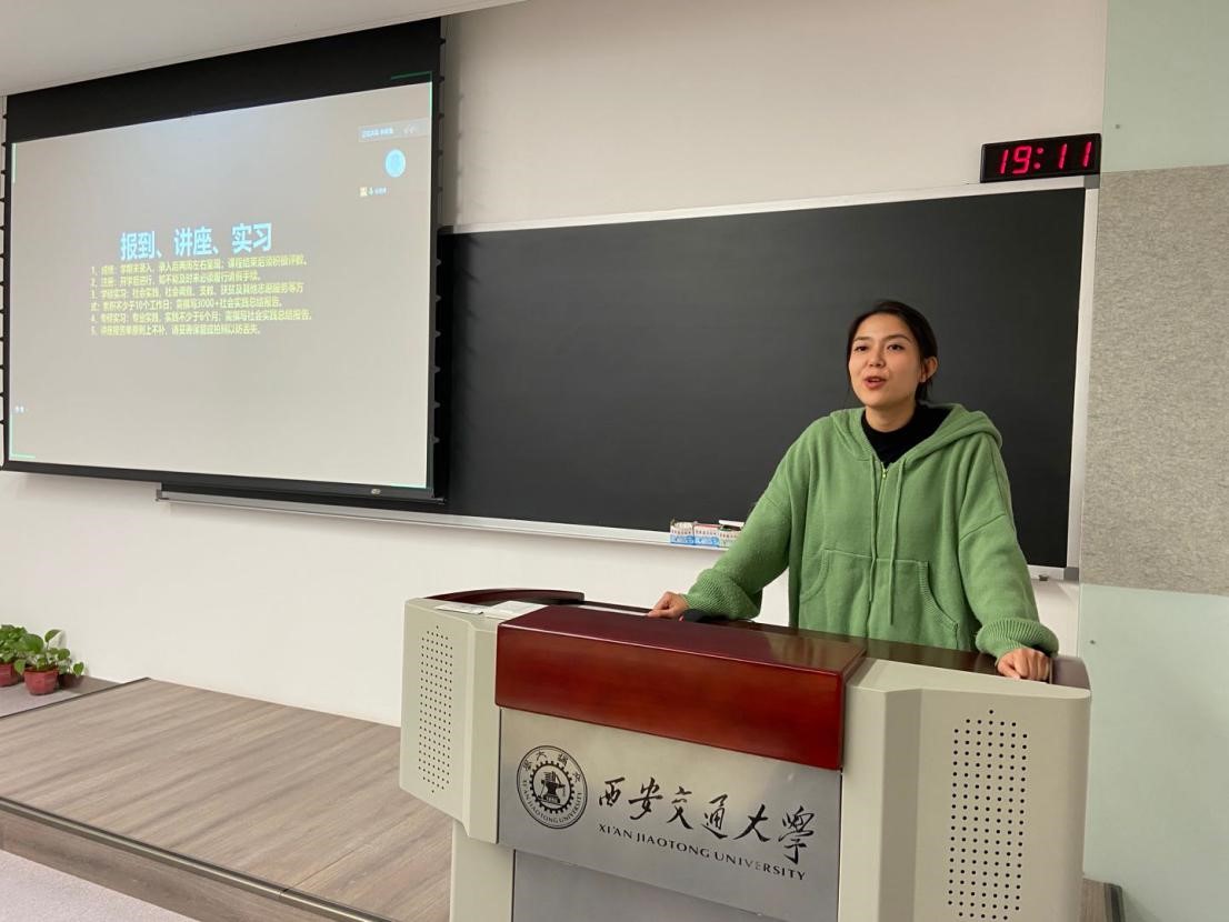 研究生教务王静茹老师围绕研究生教学相关事项进行发言。她介绍不同老师职责的分配、研究生毕业论文的重要时间节点,还对pg电子试玩