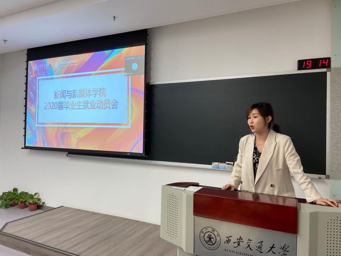 2020届毕业生就业动员会》。她详细介绍2020届和2019届毕业生就业情况,包括就业率、地域流向、行业流向、重点单位情况等。同时她还对如何使用西安交通大学就业创业信息网与用人单位签约进行指导。