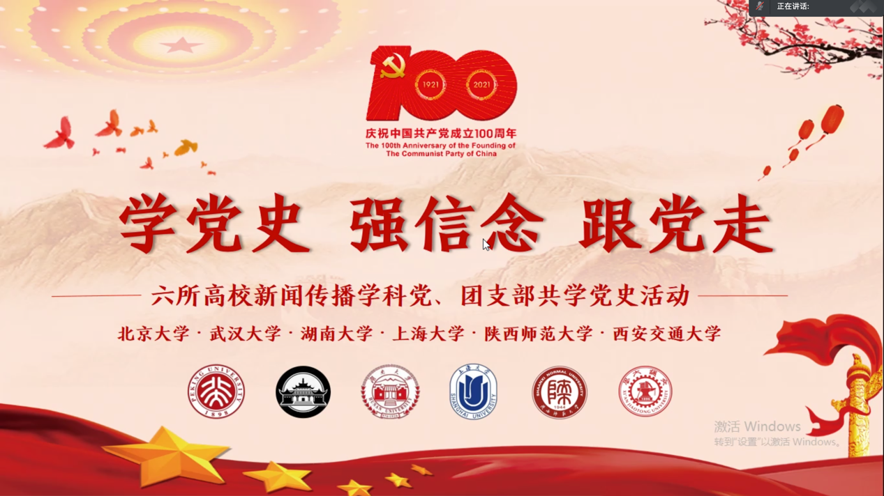 邀请北京大学、武汉大学、湖南大学、上海大学、陕西师范大学的新闻传播学科党、团支部联合举办线上共学党史活动。本次活动的主题为“学党史、强信念、跟党走”,活动由pg电子试玩(中国)官方网站