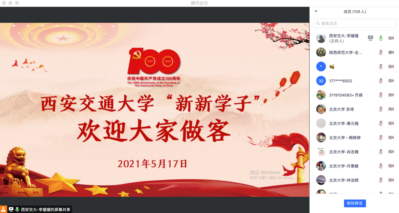 党总支书记兼院长李明德,西安交通大学党委研工部副部长薛周利;西安交通大学团委书记苏翔,来自5地6校的120余名党员、团员同志参与本次线上共学党史活动。