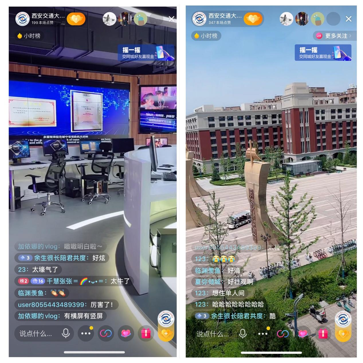 学术讲座后,孙雯老师通过抖音直播平台带领学生隔屏参观了新闻与新媒体研究院及智慧学习工场。同学们通过直播互动表示,西交大硬件软件都非常棒,为学生提供了优质实践平台及学习环境,新闻与新媒体研究院的智慧学习工场也充满科技感,很期待日后能来西交大pg电子试玩