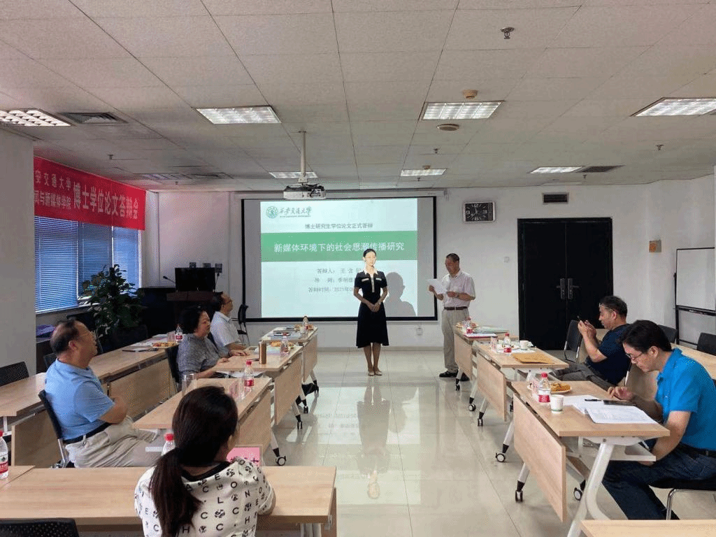 博士生王含阳同学进行了《新媒体环境下的社会思潮传播研究》学位论文正式答辩。按照答辩程序,答辩主席陈建兵教授首先宣读了答辩程序和纪律,王同学就其博士论文主要内容进行了详细的汇报,答辩委员会委员依次做出评价并提出问题,答辩人就答辩委员所提问题现场一一作答。导师李明德教授就答辩人的学习成绩和读博期间的科研成果进行介绍。