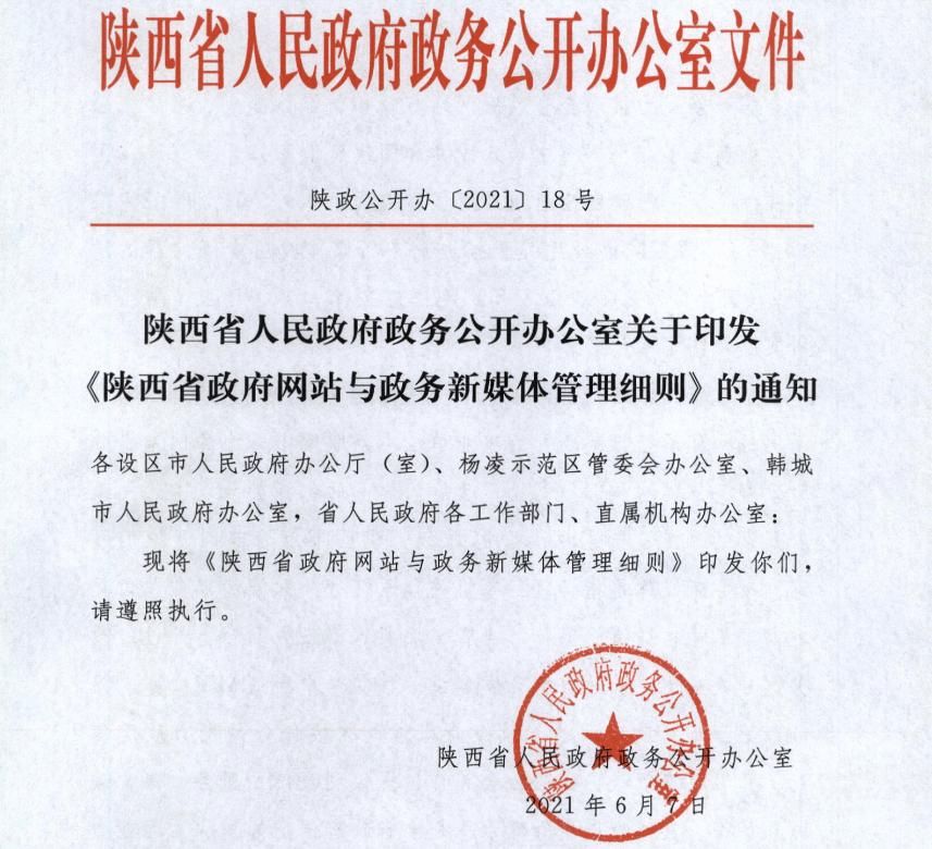 承担起草的《陕西省政府网站与政务新媒体管理细则》(陕政公开办〔2021〕18号)由陕西省人民政府政务公开办公室正式颁布,旨在推动全省政府网站与政务新媒体健康、有序、融合、创新发展。