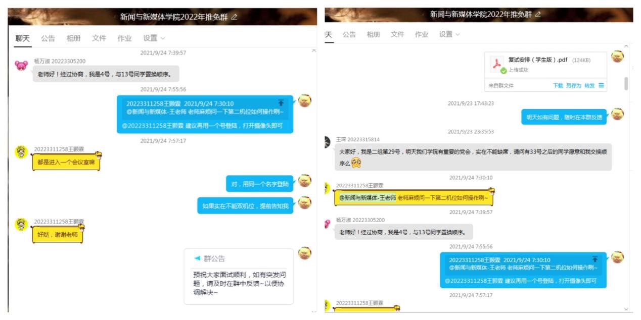组建预推免群,在群内公示复试相关的程序、规则,电话畅通及时解答考生疑问,为复试工作顺利展开保驾护航。
