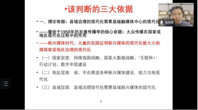 教授、《新闻与传播研究》执行主编朱鸿军就“基层治理现代化:县级融媒体中心建设定位”展开论述。他提出县级融媒体中心作为县域治理现代化的基础平台,在理论依据、历史发展、现实案例方面发展的关键因素,并对该主题和对外传播相关的研究领域作出展望。