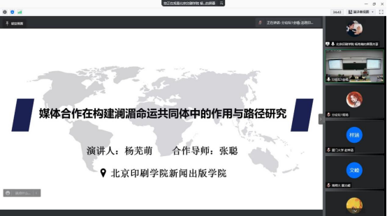 张聪老师及研究生杨芜萌做了题为“媒体合作在构建澜湄命运共同体中的作用与路径研究”的报告。她指出“澜湄合作”是共商共建“一带一路”的重要平台,但现阶段媒体合作情况面临缺乏清晰规划和资金存在不足等方面的问题,提出了拓展澜湄合作主体视角研究维度、发挥媒体在构建澜湄命运共同体中的独特作用、构建中国主导的中外媒体合作路径、提供新型的中外媒体合作方式四种路径。