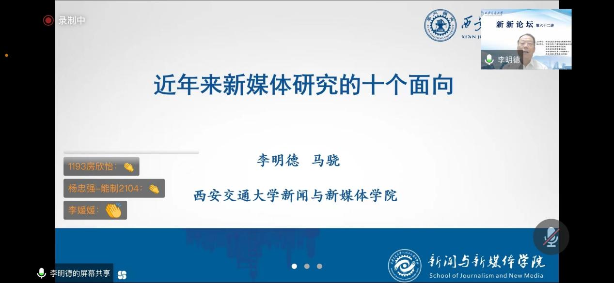 李明德教授的报告题目为“新媒体研究的十个面向”。李明德教授指出随着新型传播技术对人类生活的日益嵌入,学界研究开始转向新媒体领域,在梳理了2017年至2021年国内学术期刊中与新媒体研究主题相关的文献之后,按照主题聚类,将遴选出的文献整合成十大要点,分别是:人工智能技术推动传媒业发生重大变革,社会结构遭遇挑战;互联网颠覆大众传播线性模式,进一步实现工具理性和价值理性的共融;移动互联网创造了新的“现场”与“在场”,自由跨越时空变现;身体传播的重要性凸显,媒介传播成为编织关系网络的身体实践;区块链技术对新闻业具有特别价值,进一步解决了价值传输问题;短视频作为碎片化的冷媒介,带动视频文化和新闻生产的“转基因”;5G进一步推动传播变革,万物皆媒时代已经到来;社交媒体互联诱导浅层思考成为习惯,公共传播的理想模式亟待重建;媒介逻辑植入社会,社会媒介化成为未来社会发展的现象级趋势;数字鸿沟再度演变,代际鸿沟、智能鸿沟越发突出。