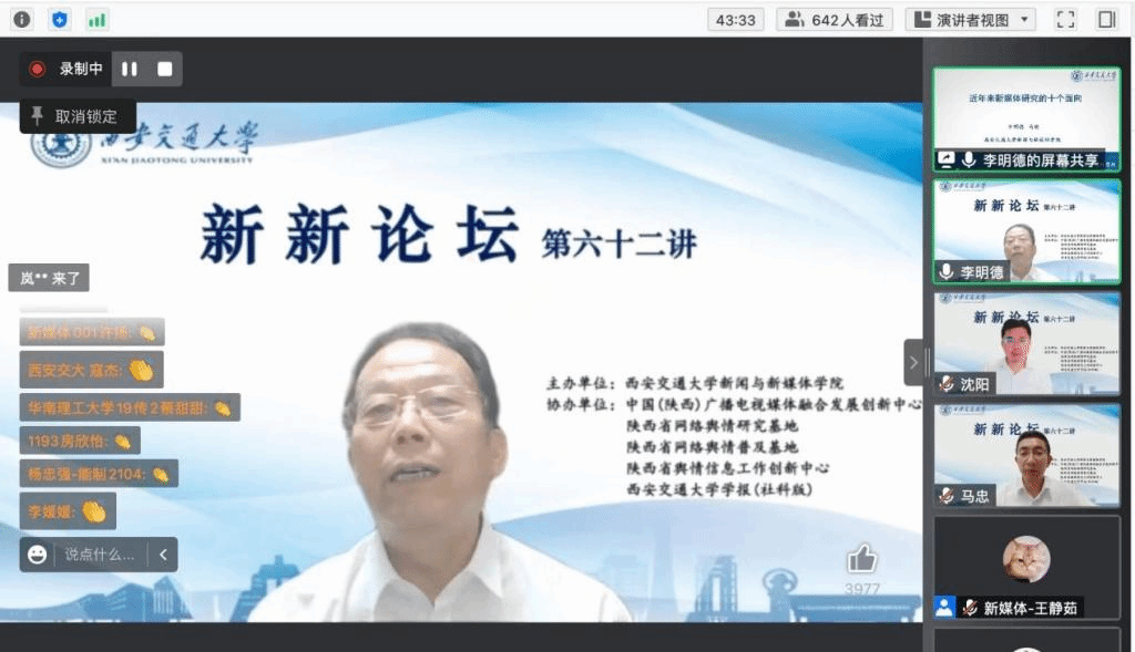 特别邀请到了清华大学沈阳教授和西安交通大学李明德教授作为论坛改版的首期嘉宾,两位专家围绕新闻传播前沿问题分别以“元宇宙的发展与挑战”及“新媒体研究的十个面向”为主题开展了精彩讲座,吸引了来自校内外学界、业界等近700人次的热情参与。