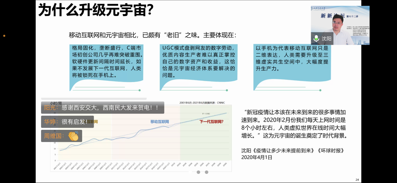 沈阳教授在题为“元宇宙的发展与挑战”的讲座中,探讨了元宇宙的发展历程与未来的研究前景。