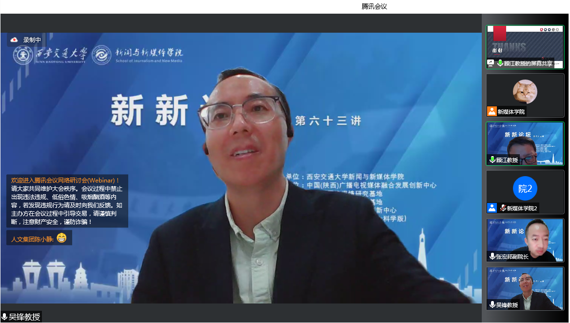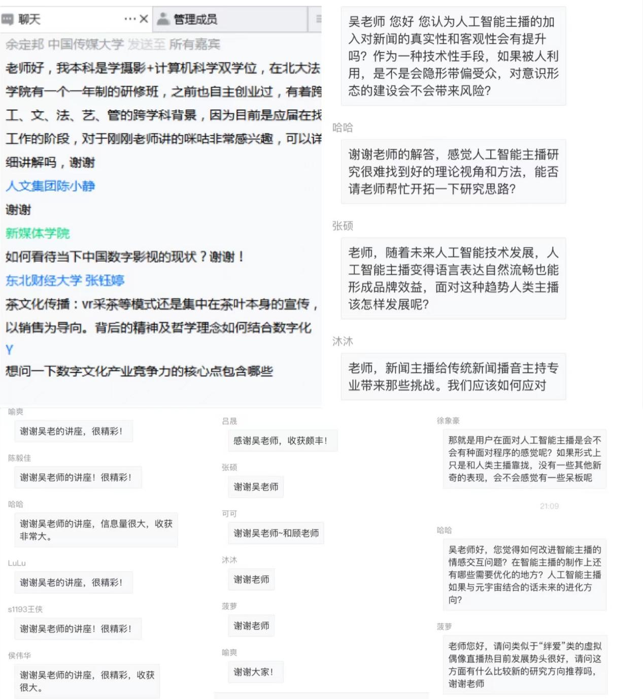 随后,吴教授从人类主播、受众、产业格局三个方面探讨了人工智能主播对文化产业的影响。对于人类主播来说,人工智能主播虽然能够避免由于身心疲劳、注意力不集中等原因造成的误读、漏读,使得信息播报的准确性大大提高,但其依旧不具备人类主播的思考创作、情感判断和个性化表达等特征,目前无法代替人类主播;对于受众而言,人工智能主播可以发挥自身优势,通过提升新闻信息或者节目自身和受众之间的互动性、临场感和趣味性,来还原新闻传播“人际沟通”的本质;在产业格局方面,高效率和高质量的人机合作将会促进人工智能与新闻媒体的进一步融合与共生,从而实现价值和功能的双赢。在互动环节吴锋教授和大家一起探讨了人工智能主播的未来发展方向,人工智能主播在情感交互、虚拟交互等方面还有较大的发展空间,但当前人工智能技术在新闻传播领域的应用依旧存在一些问题,需要专家学者、研发人员和新闻媒体从业者的共同努力。