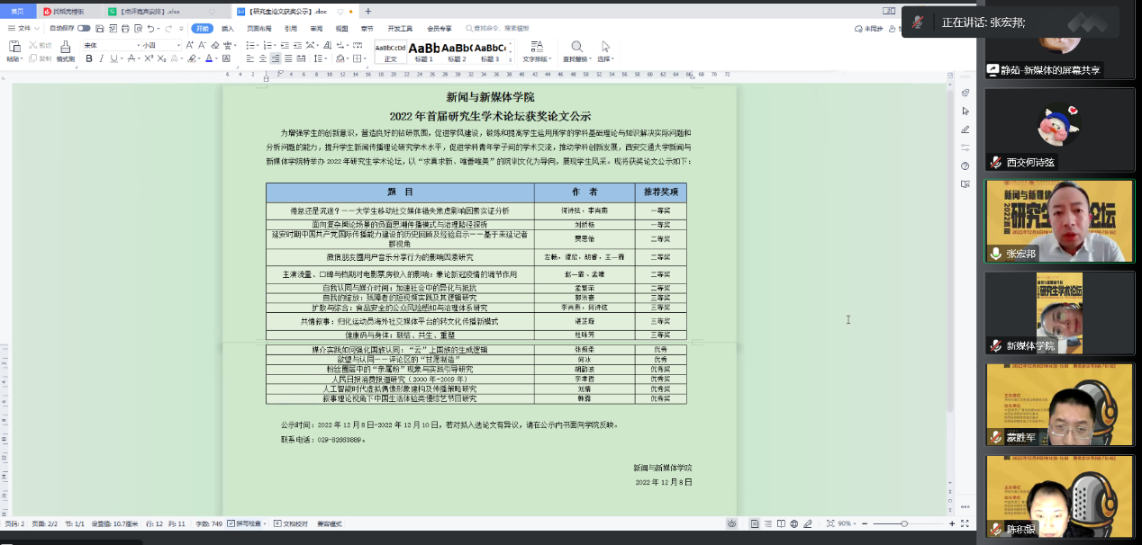 陈积银教授高度评价获奖论文的选题,认为谌芷璇研究的冬奥会期间国外社交媒体传播问题、杜咏芳研究的健康码问题与当下现实结合紧密,面向现实需求进行学术探讨。陈教授还对《健康码与身体:联结、共生、重塑》、《自我认同与媒介时间:加速社会中的异化与抵抗》两篇论文提出优化建议,启发学生辩证、全面看待问题。