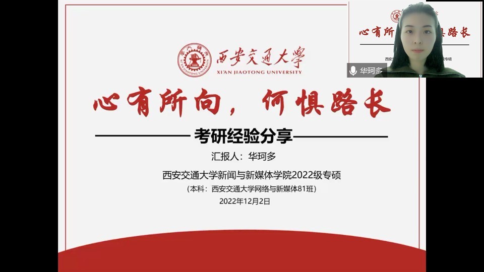 张婉柔和华珂多分别就保研和考研的准备工作进行了分享。张婉柔详细讲解了保研的资格获取、志愿填报、面试技巧等,鼓励同学们早做准备、做两手准备,保持良好的心态,不因一时的挫折放弃读研的信心。华珂多就考研笔试向同学们进行了详细的介绍,她分享了自己在复习各科目时的方法和时间安排,提醒同学们要重视每一门笔试科目,要相信自己的付出与实力,克服紧张情绪,在笔试中发挥出自己应有的水平。