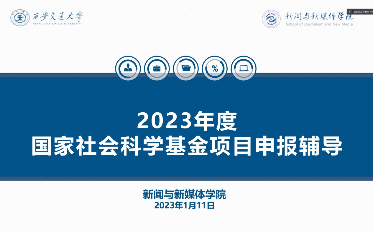 假期不松懈,科研不停歇。为进一步提高高级别项目申报质量和项目中标率,11日上午,新媒体学院在线召开2023年度国家社科基金项目申报辅导会。李明德、马忠、吴锋 三位教授应邀对申报2023年度国家社科基金项目的青年教师进行在线辅导。申报辅导会由孙鹤立副院长主持。