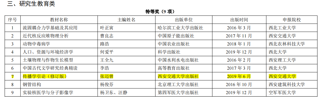 张迈曾、李明德教授领衔团队在国内较早开设传播学基础理论课程,2002年即出版《传播学引论》教材,曾获第九届西安交通大学优秀教材一等奖(2004)。《传播学引论》长期作为西安交通大学新闻传播学专业硕士研究生入学考试指定书目,并作为《传播学基础概论》等本、硕课程指定教材,增印上万册,深受师生和其他使用者好评。