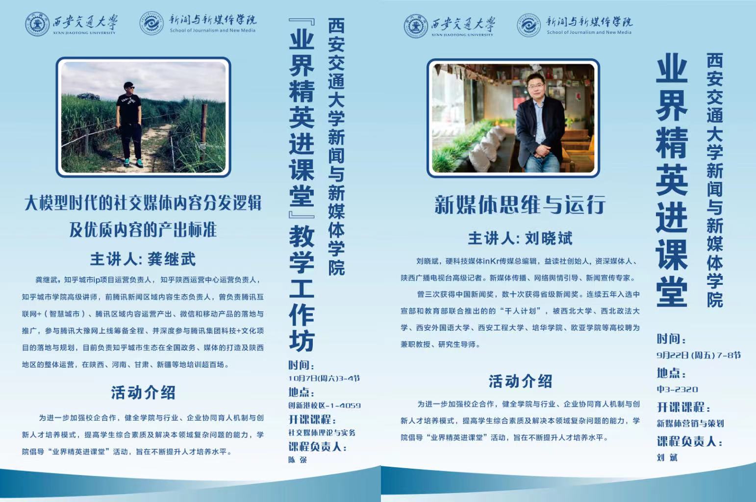本学期开学以来先后邀请到隆基股份媒体运营负责人田野、硬科技媒体inKr传媒总编辑刘晓斌、知乎城市IP项目运营负责人龚继武、校友代表西北有色金属研究院刘威、中建五局西北公司高级业务经理武道源以及学生代表等进行了交流分享,将最新业界动态和实务操作技能以案例分析、经验传授和课堂互动的形式寓教于乐,在具有较高操作性和实用性的新媒体课程教学中碰撞出思维的火花。