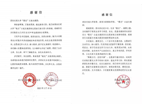 跨越山海,相互成就。“微光”公益支教团队荣誉众多,获评2021年陕西省“三下乡”社会实践省级优秀团队,并多次获得校级优秀团队等荣誉。行动之外,支教团队坚持思考,将活动持续推向深入,形成2篇学术论文、1篇实践纪实和3篇调研报告,从不同专业角度,以访谈、问卷等形式了解学生所在村镇教育情况,全面分析大学生云支教现状,总结问题及经验,并提出优化路径。教学相长,公益支教活动是大学生志愿者和村镇学生共同进步的过程。四川省仪陇县、河南省获嘉县以及四川阿坝的相关部门向团队寄来感谢信,信中提到乡村教育对于乡村振兴具有重要意义,支教活动课程为孩子们奔赴未来的希望之路添砖加瓦,希望能与支教团队再次合作,点亮乡村教育事业的璀璨前景。