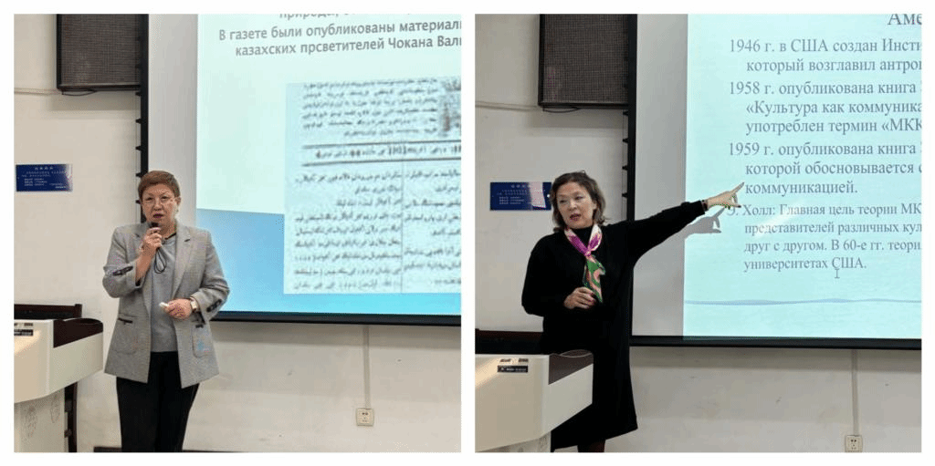 曼楚克·穆卡什娃副教授作了题为“哈萨克斯坦新闻传播史”的报告。她从哈萨克斯坦国立大学(又名哈萨克斯坦阿拉法拉比国立大学)校名的由来引入报告主题,讲述了哲学界阿拉法拉比在哈萨克斯坦的地位,并带领在场师生重回19世纪后半叶,以哈萨克斯坦第一份报纸为起点,追溯哈萨克斯坦新闻史。此外,曼楚克·穆卡什娃热情介绍了哈萨克斯坦大学与中国高校的密切合作,并向在场师生推荐了自己撰写的两本哈萨克斯坦新闻史书籍。奥林泰·奥沙诺娃副教授作了题为“跨文化交流”的报告。她从理论角度切入,细致讲解了跨文化传播在哈萨克斯坦的发展及、跨文化传播的要素、跨文化传播理论以及文化震惊。最后,她重点介绍了哈萨克斯坦同中国自古以来的跨文化交往史,并认为“一带一路”即是很好的跨文化交流项目。