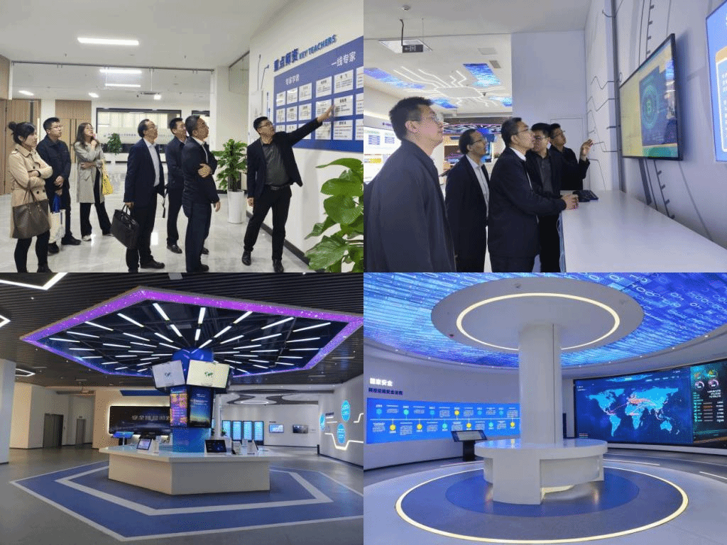 党委书记林细俤、大学科技园管理有限公司总经理刘晓阳、副总经理张勤与教育主管郝越敏等陪同考察。调研组共参观考察了基地的七个教学场地并观看宣传片。随后,双方就基地建设理念、政企社创新协作模式、网信人才培养课程体系等方面进行深入交流。