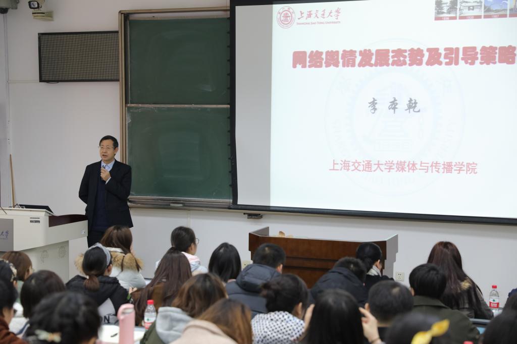院长李本乾教授。李本乾教授在其学术研究课题与相关案例的基础上,以“网络舆情的发展态势及引导策略”为题侃侃而谈,为在场师生带来了一场不可多得的学术盛宴。本场论坛不仅吸引了众多交大学子前来参加,其他高校师生及业界人士也纷纷慕名而来,现场气氛热烈,座无虚席。