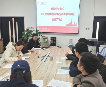 为深入贯彻中央八项规定精神学习教育实施方案,近日新闻系党支部在主E409会议室召开专题组织生活会,深入学习领会习近平总书记关于加强党的作风建设的重要论述和中央八项规定及其实施细则精神。会议由党支部书记李巨星主持,支部全体师生党员参加。