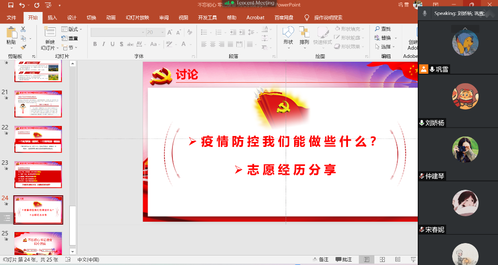 讨论结束后,党支部书记巩雪鼓励大家积极参与抗疫志愿服务活动,秉持“奉献、友爱、互助、进步”的志愿服务精神,为打赢防疫攻坚战作出不懈努力。