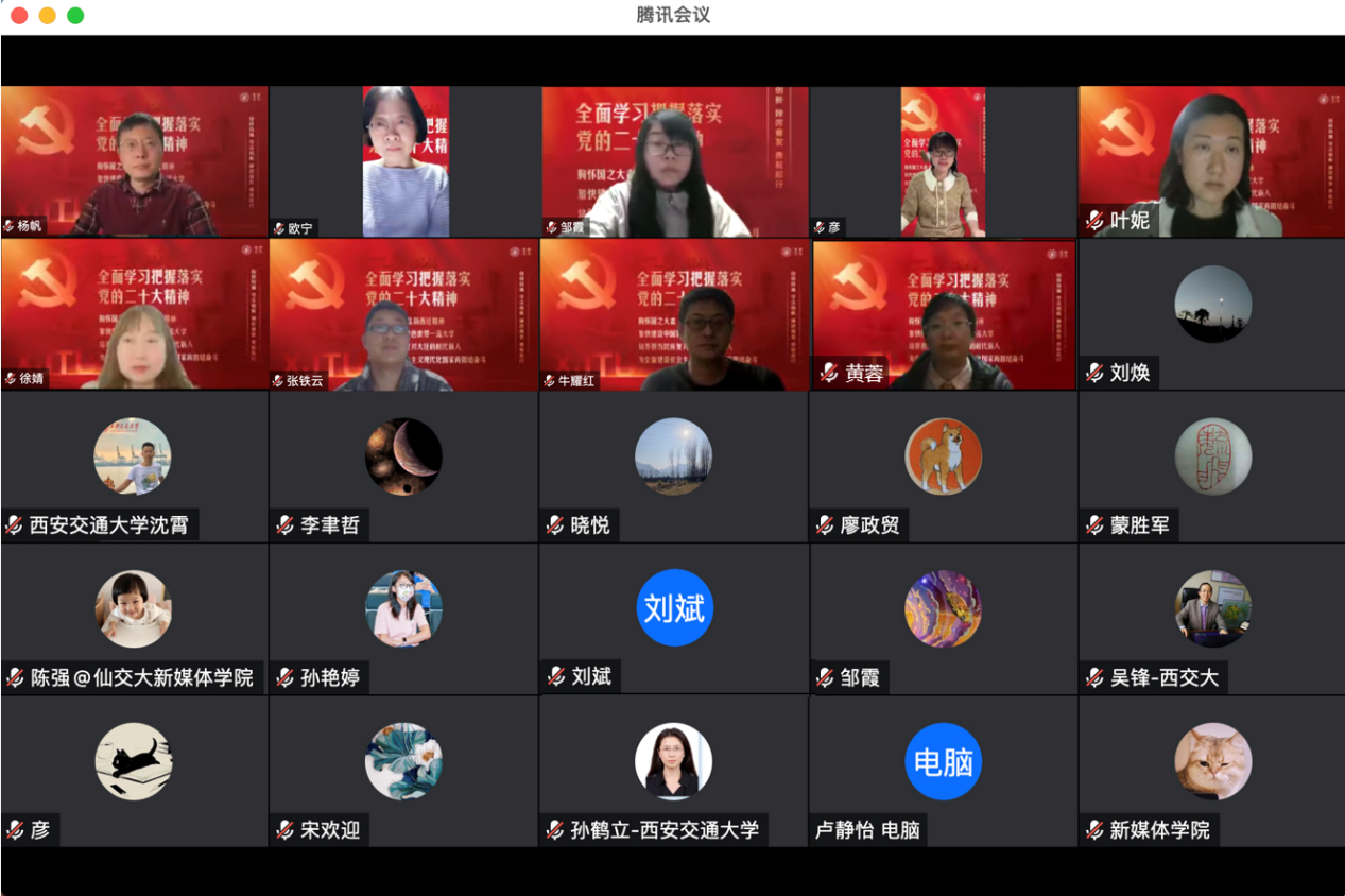 马忠教授分享学习体会时认为,党的二十大报告高屋建瓴、内涵丰富,要把学习大会报告同学习习近平总书记系列讲话精神结合起来,反复学、系统学、对比学,深刻领悟精髓要义,指导工作实践。他表示,作为一名高校教师,要结合教学科研等工作实际,认真领会党的二十大报告中关于实施科教兴国战略、推进国家安全体系和能力现代化的重要论述。要立足新闻传播学学科的立场、观点和方法,用好科学思维,构建学科话语体系,树立学科自信、自立、自强,切实发挥学科作用,助力提升我国国际影响力、感召力和塑造力。