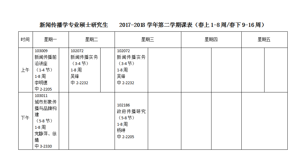 新闻传播学专业硕士研究生 2017-2018学年第二学期课表