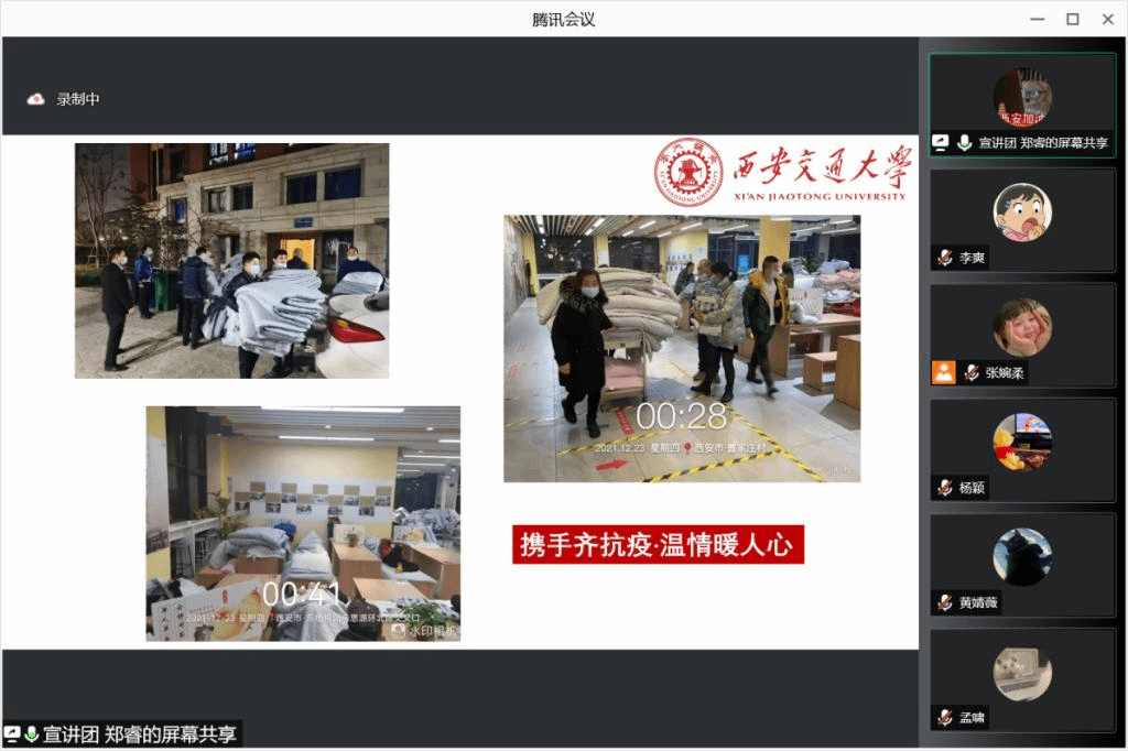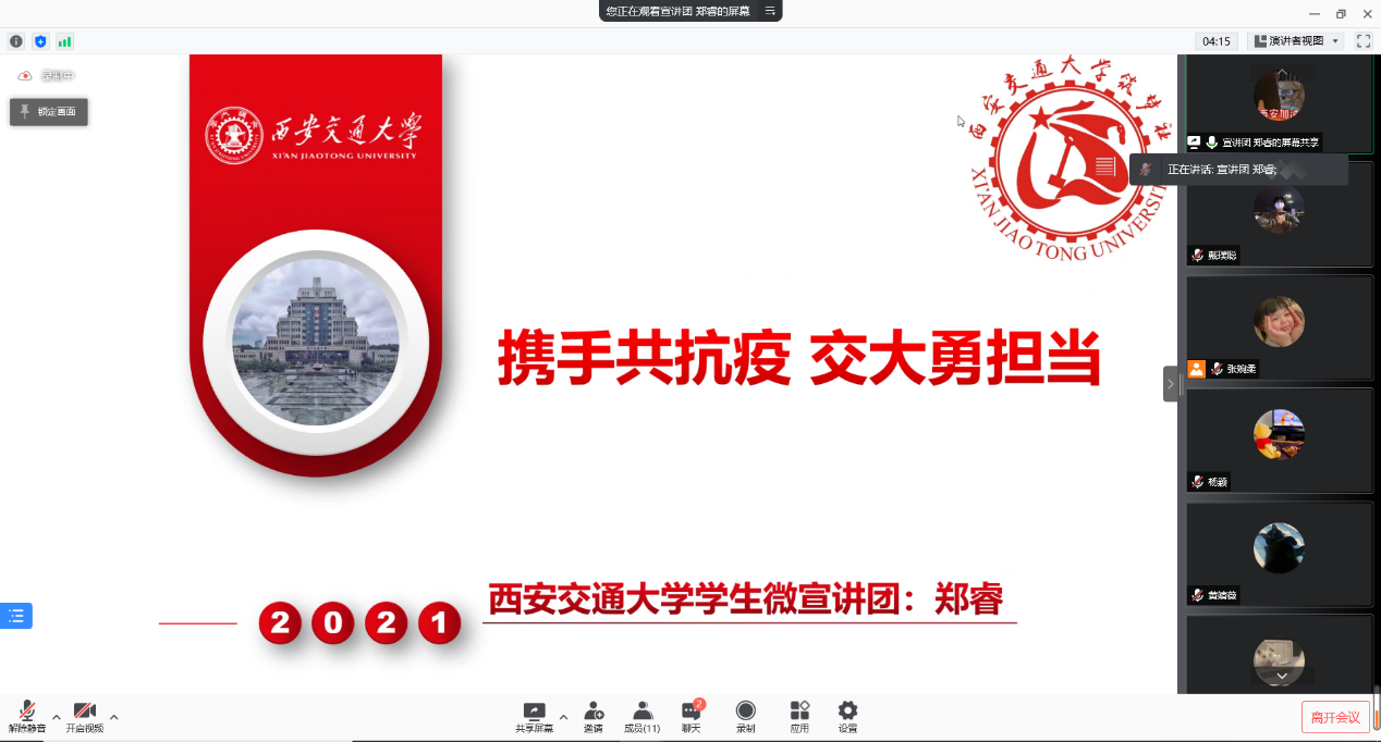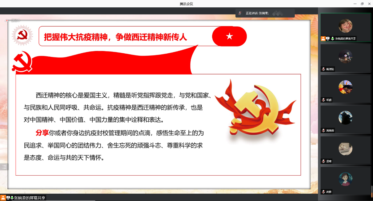 本次会议邀请了来自西安交通大学微宣讲团的郑睿同学,以“携手共抗疫,交大勇担当”为主要内容,郑睿同学结合西迁精神展开了声情并茂的主题演讲。支部成员依次分享交流抗疫过程中所见所学,采用线上的方式,召开了这场特殊的组织生活会。