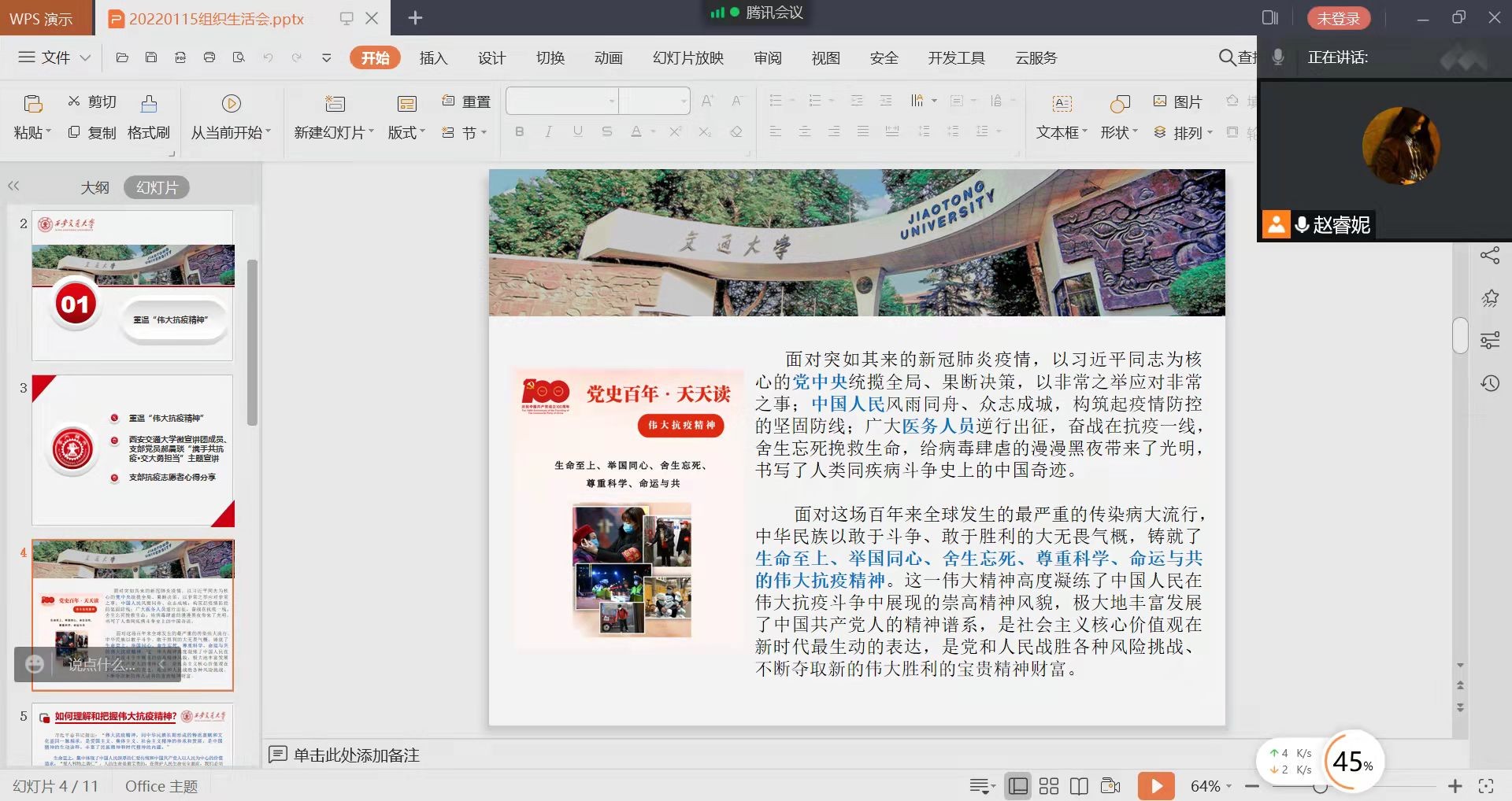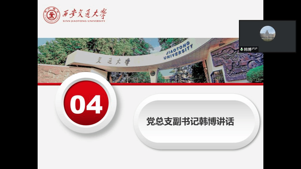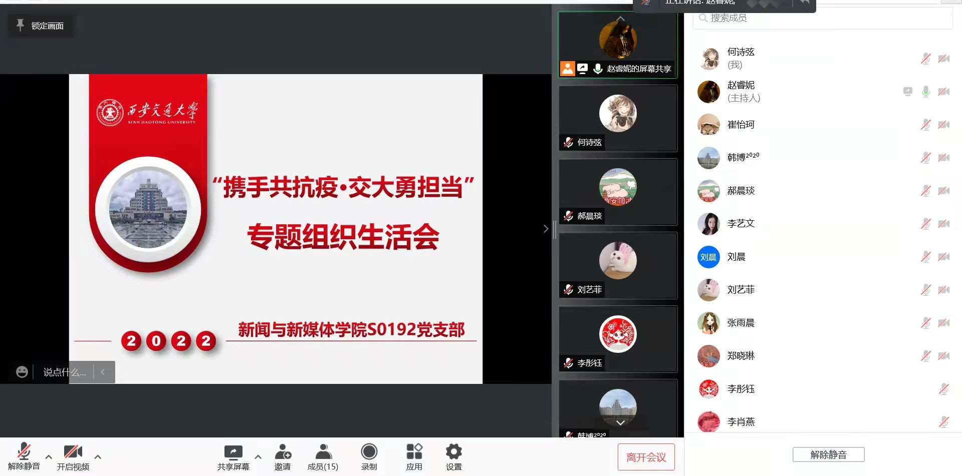 会议最后,党总支副书记韩博老师向同学们讲述国家和省上所付出的抗疫努力,强调党和国家事事以人民为先,“这是社会主义的优势,是我们国家与西方国家最大的不同”。韩书记再次详细介绍学校在抗疫期间的工作安排、组织管理以及各种细节,向同学们转达校领导的关切,并对支部抗疫专班以及每一位同学提出表扬。“关键时刻,更能看出一个人是否有一颗利他的心。大家能够进入交大,肯定是足够优秀的,而这次疫情当中的种种,让我感动,让我钦佩。”