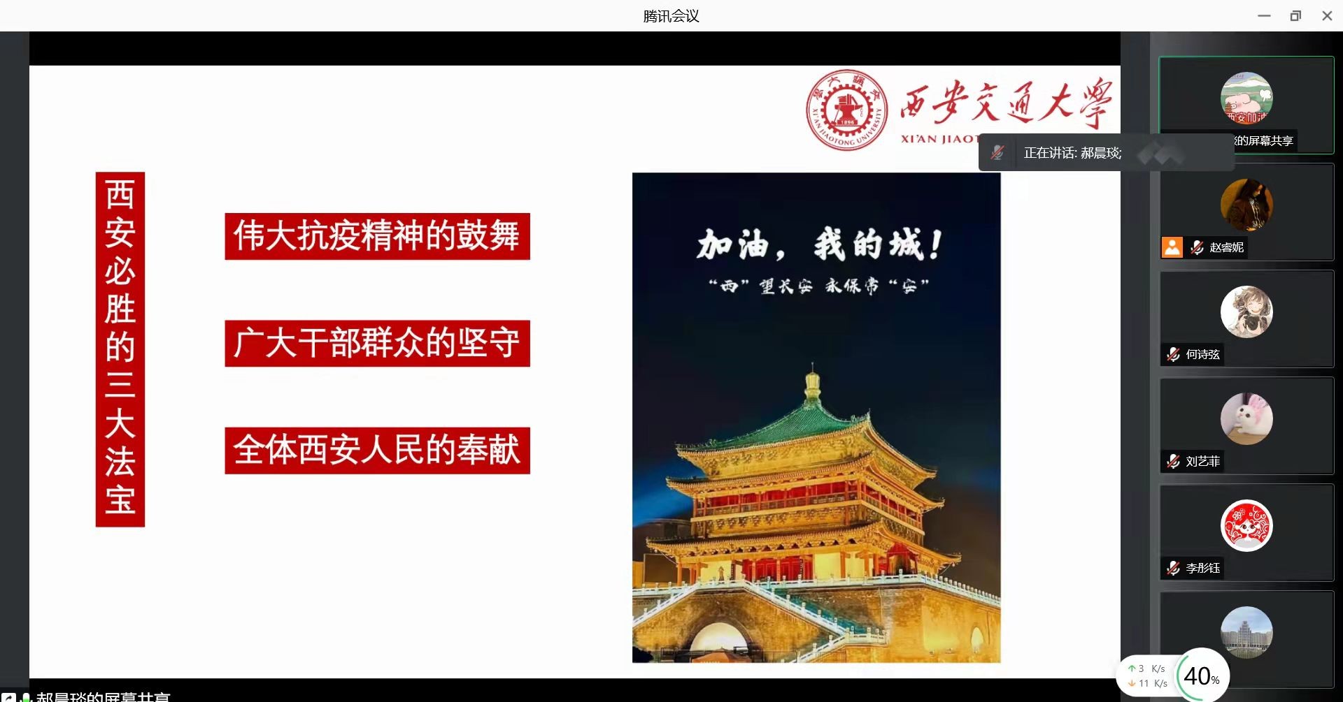 会上,筑梦社成员、S0192党支部党员代表郝晨琰同志结合西安疫情现状,就交大人的抗疫实践展开宣讲。她指出,在西迁精神的感召下,学生、教师、医务工作者、基层干部、保卫队员、后勤保障人员等全体交大人共同参与,把坚决打赢疫情防控阻击战作为践行西迁精神的重要见证,此刻,西迁精神不再是一个抽象的概念,“听党指挥跟党走,与党和国家、与民族和人民同呼吸、共命运”早已成为交大人向疫情发起决战的冲锋号角。我们相信,只要全体交大人同舟共济、全力以赴,我们就一定能赢得最后的胜利!