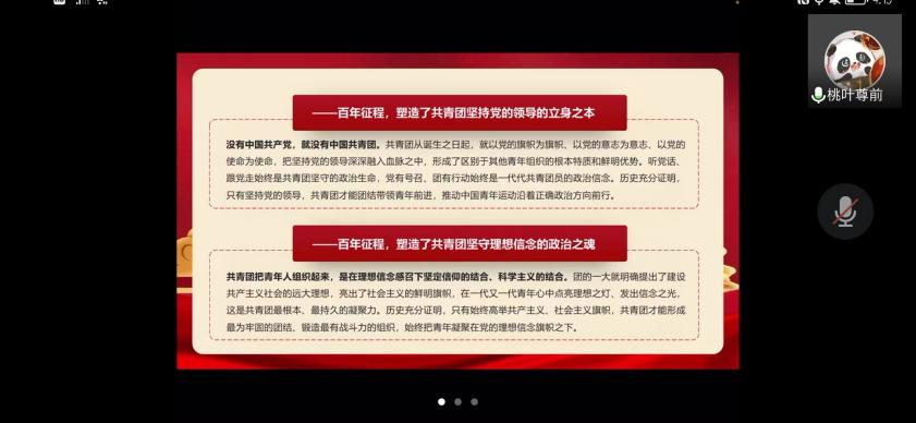 接下来,魏小璇同志展开重要讲话精神的第二部分领学。她表示一百年来,共青团坚定理想、矢志不渝,形成了宝贵经验。而百年征程,塑造了共青团坚持党的领导的立身之本,坚守理想信念的政治之魂,投身民族复兴的奋进之力,扎根广大青年的活力之源。她鼓励同学们成长为有理想、敢担当、能吃苦、肯奋斗的新时代好青年。