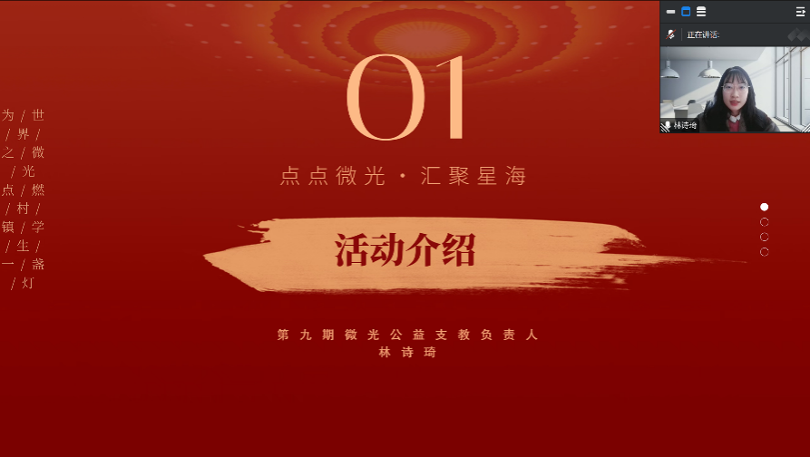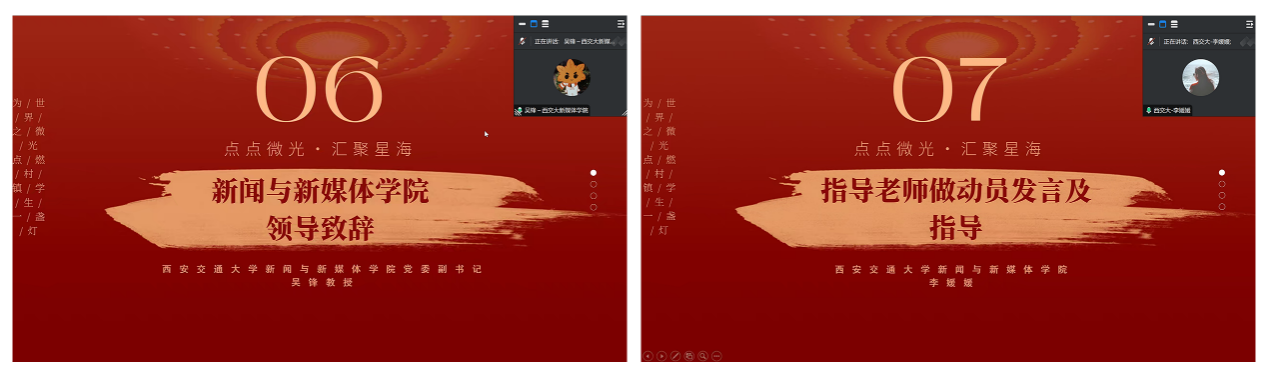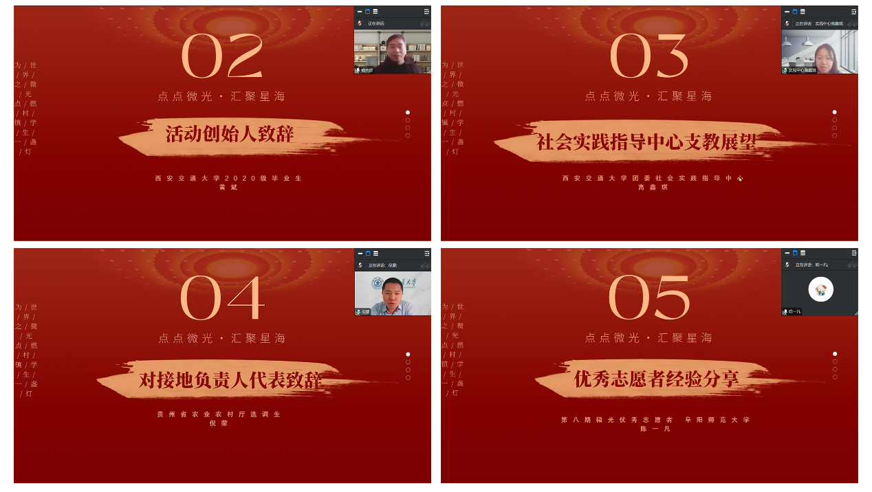 党委副书记吴锋、辅导员李媛媛、贵州省农业农村厅选调生倪蒙、西安交通大学团委社会实践指导中心高鑫琪、项目创始人黄斌、优秀志愿者陈一凡以及来自全国数百名老师、志愿者、学生及家长参与本期“微光”线上公益支教开幕式。