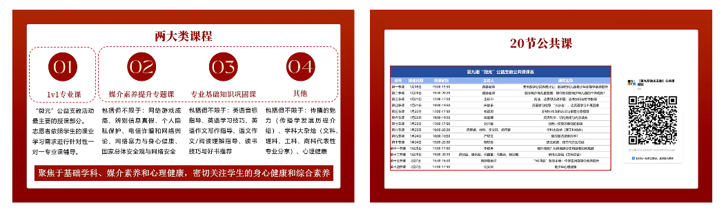 本届活动在延续往届一对一的语数英、政史地、物化生等专业课辅导及课外公共课程的基础上,特别增设了由西安交通大学学科教授主讲的有关媒介素养和心理健康的公共课程,致力于提升学生的媒介素养和心理素质,助力其全面成长。