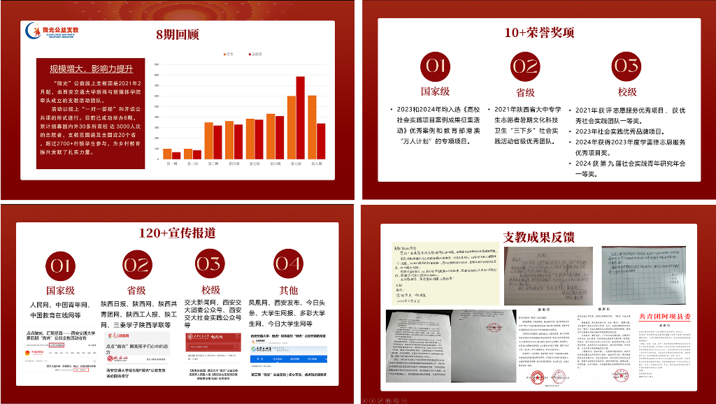 “微光”公益支教秉持着“为世界之微光,点亮村镇学生一盏灯”的理念,迄今为止已成功举办八期,累计招募来自国内外30多所高校的3000多名志愿者,支教服务范围覆盖全国20余省份,超过2700名村镇学生参与其中,近10万人参与或从中受益。历年来,“微光”佳绩频传,揽获十余项各级荣誉。2024年,在1400多支立项队伍中,“微光”脱颖而出,荣获优秀品牌项目,并在第九届社会实践青年研究年会中斩获一等奖。深耕线上支教的“微光”得到社会及参与者的广泛好评,媒体宣传成效好,民众评价口碑高。